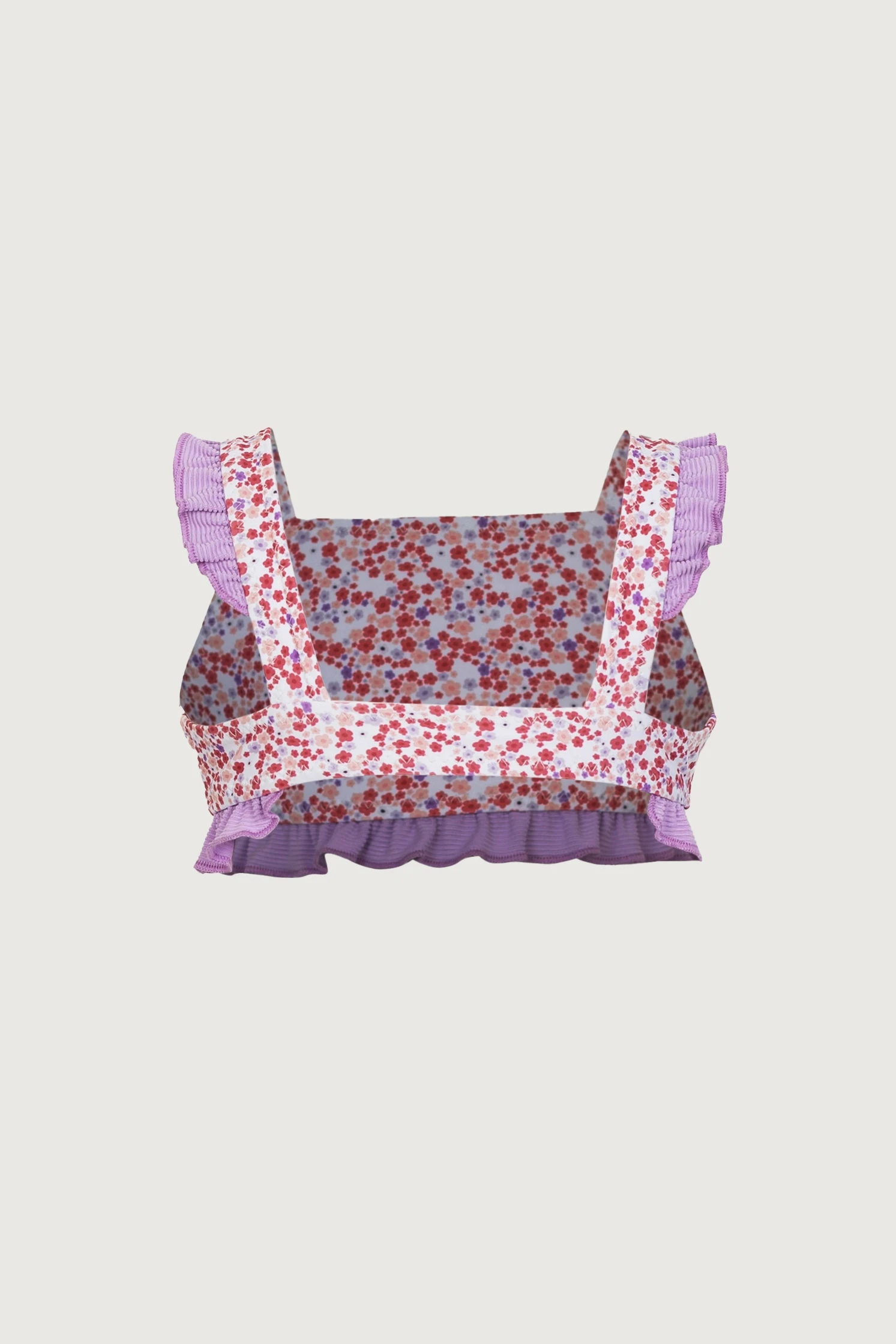The ruffle bandeau top has a square neck with ruffle cap sleeves on the straps.