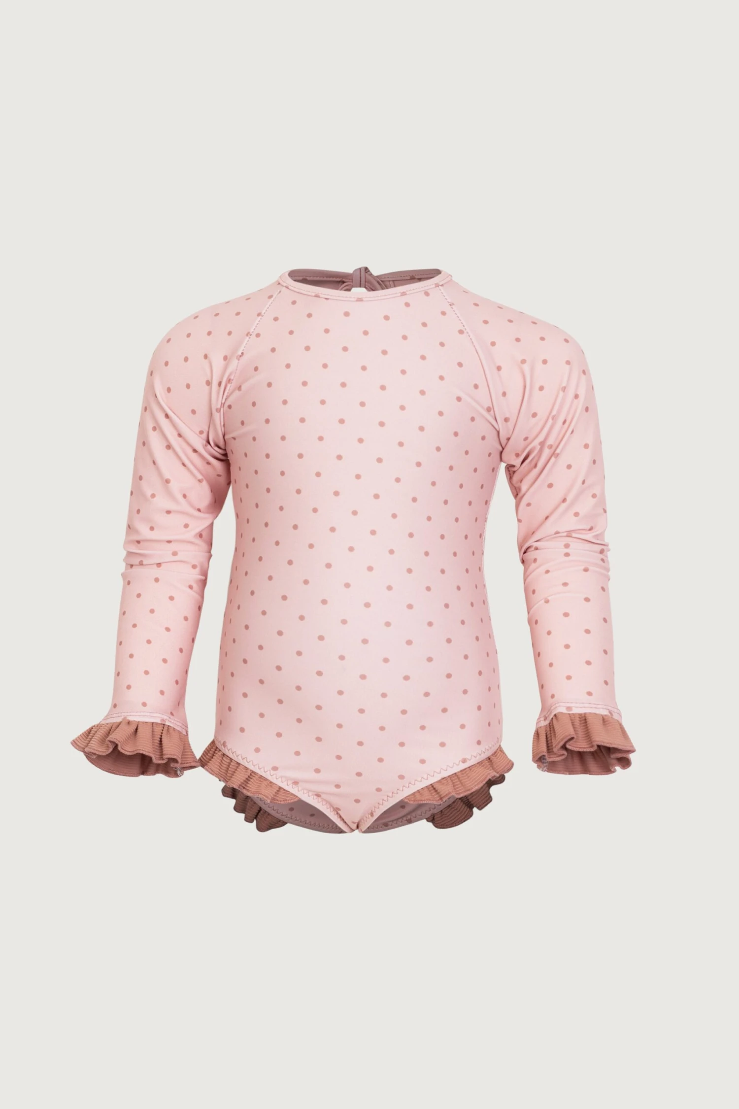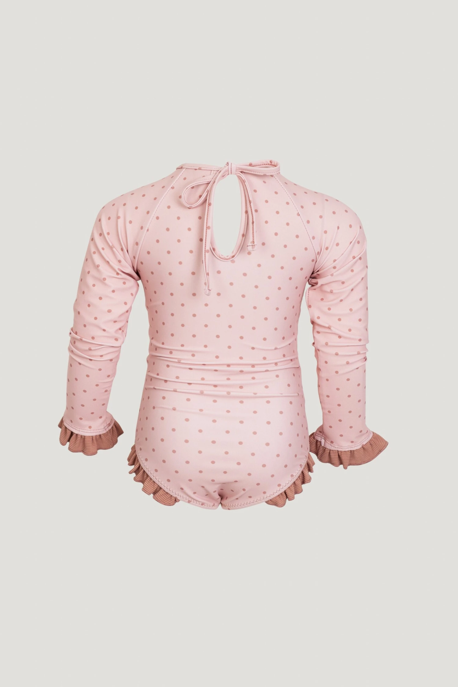 This one-piece rashguard will protect your mini from the sun in style. It features a keyhole tie closure at the back and ruffle details at the sleeves and leg openings.Â