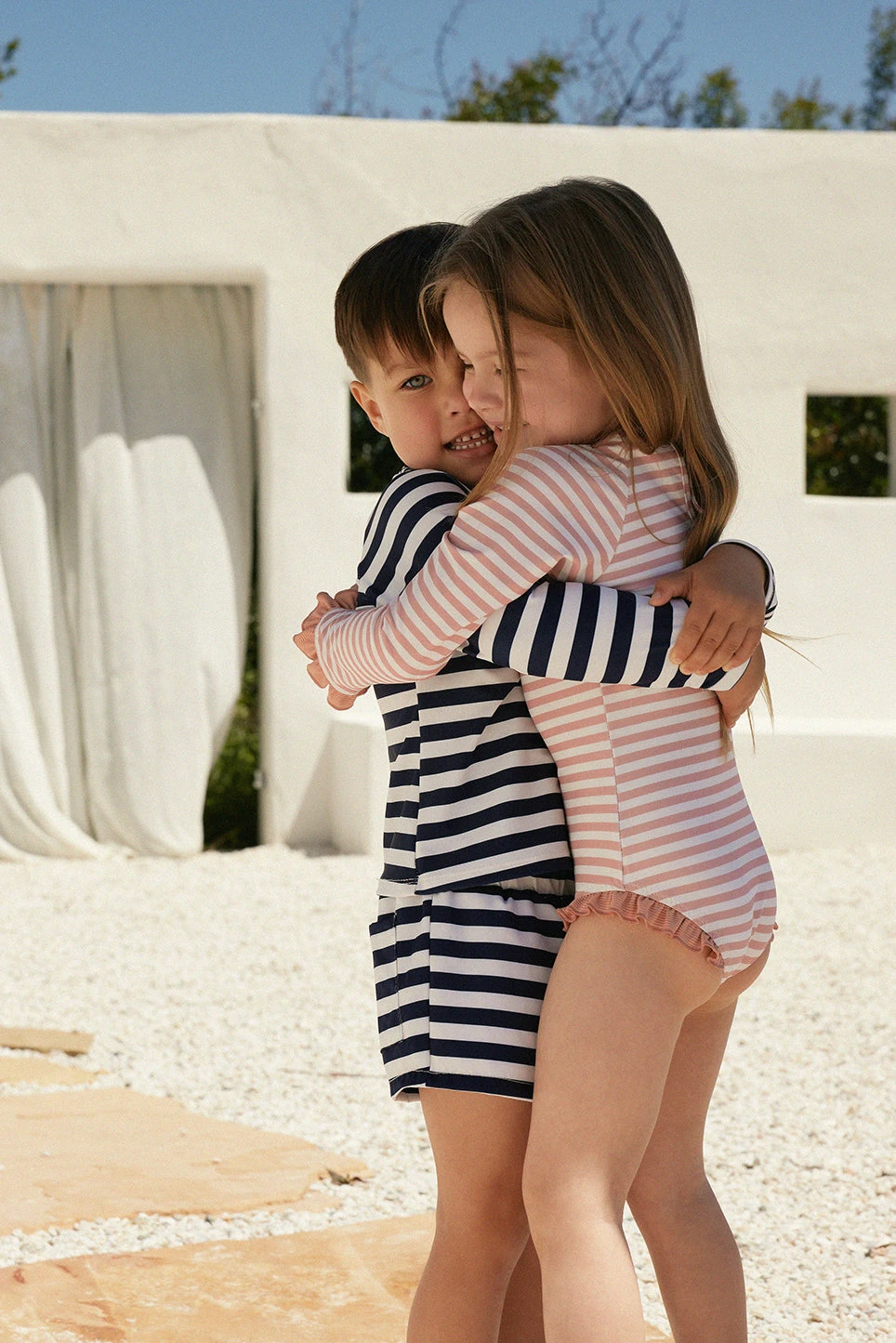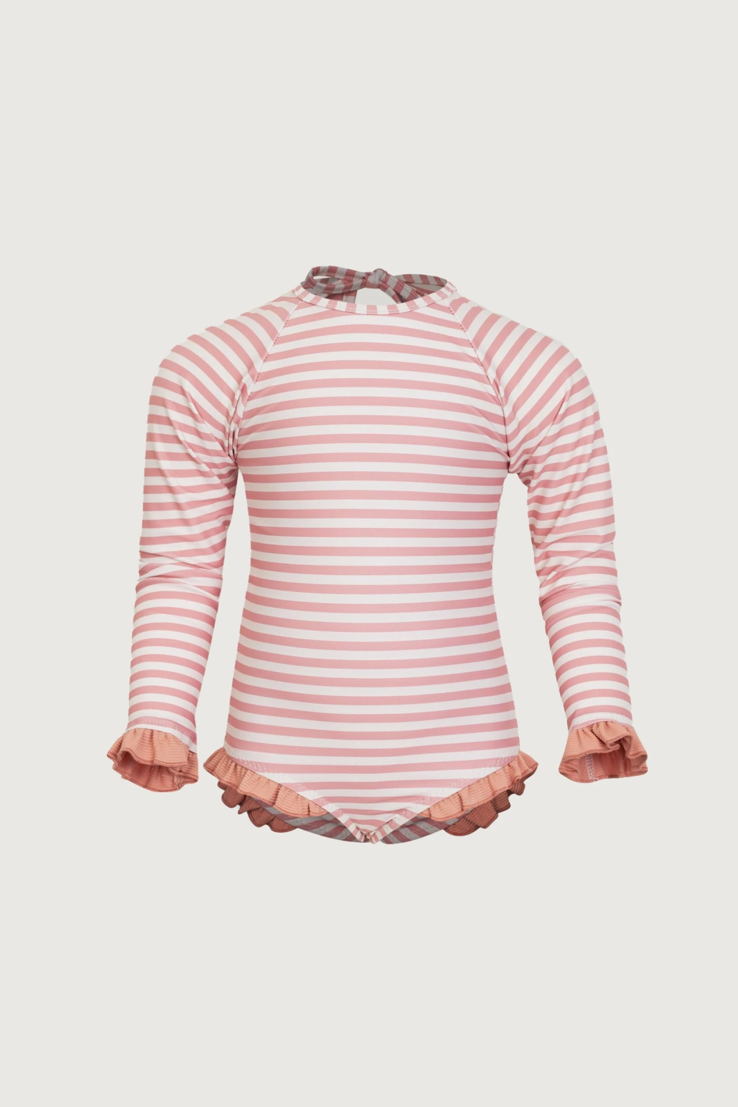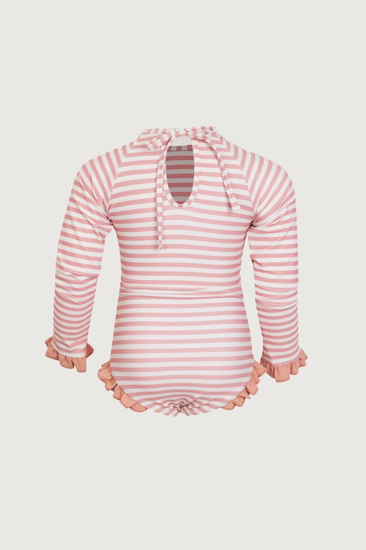 This one-piece rashguard will protect your mini from the sun in style. It features a keyhole tie closure at the back and ruffle details at the sleeves and leg openings.Â