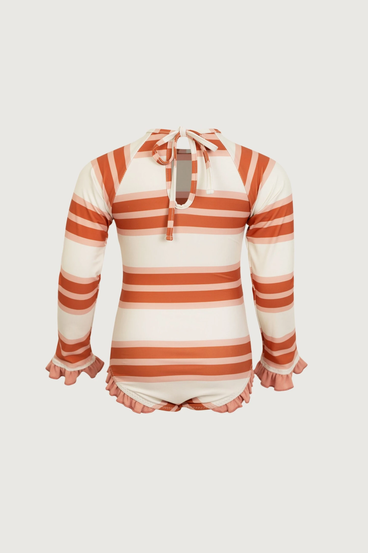 This one-piece rashguard will protect your mini from the sun in style. It features a keyhole tie closure at the back and ruffle details at the sleeves and leg openings.Â