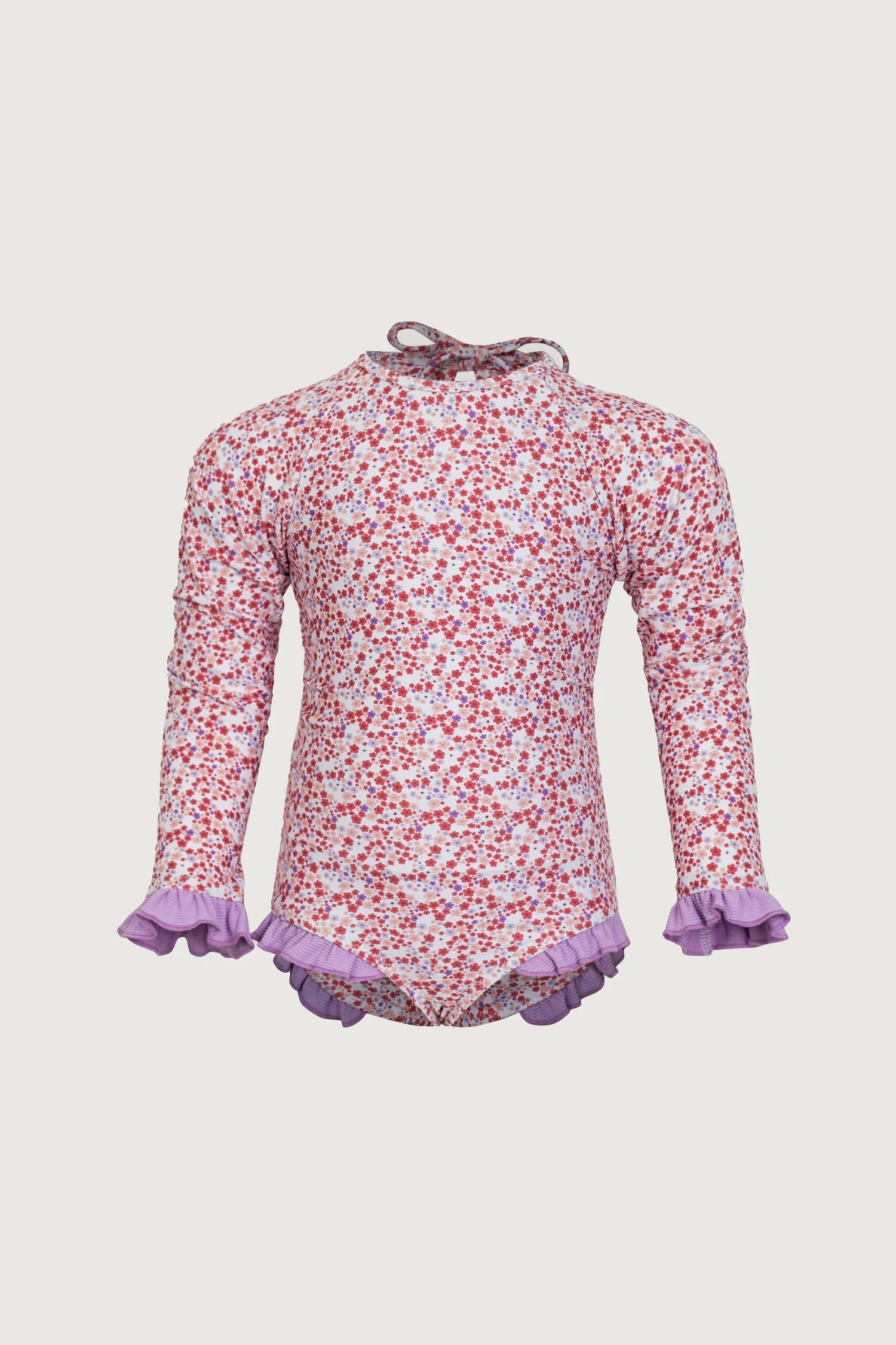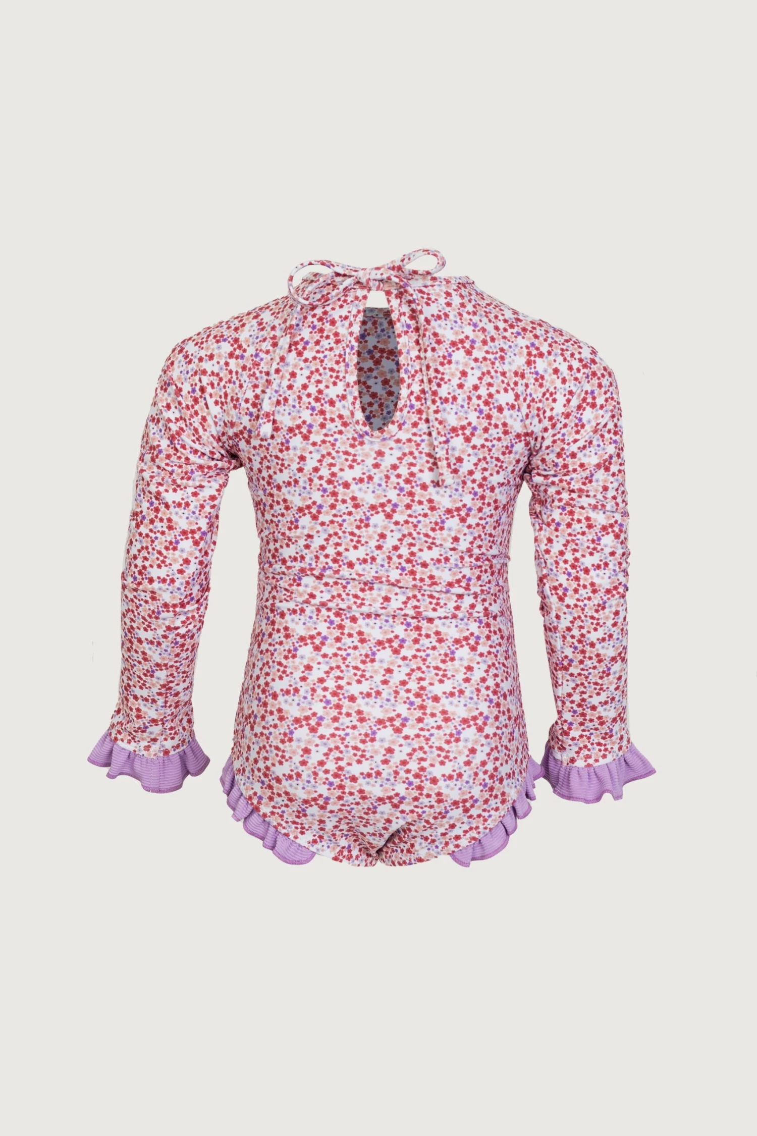 This one-piece rashguard will protect your mini from the sun in style. It features a keyhole tie closure at the back and ruffle details at the sleeves and leg openings.Â