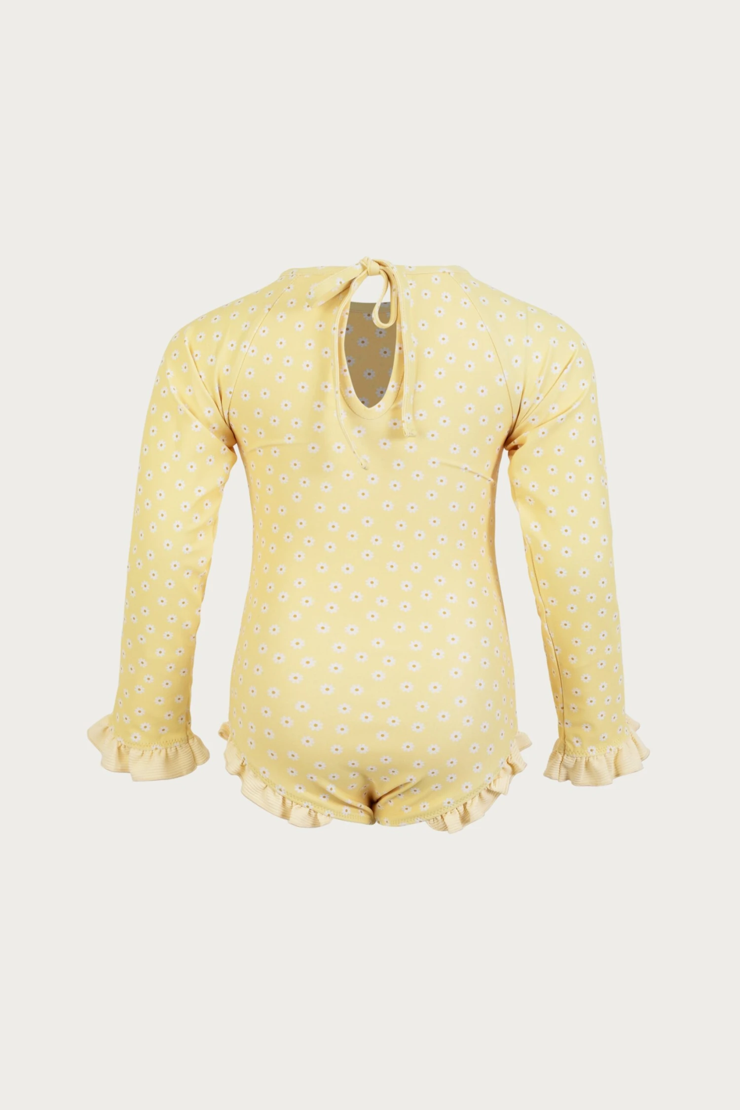 This one-piece rashguard will protect your mini from the sun in style. It features a keyhole tie closure at the back and ruffle details at the sleeves and leg openings.